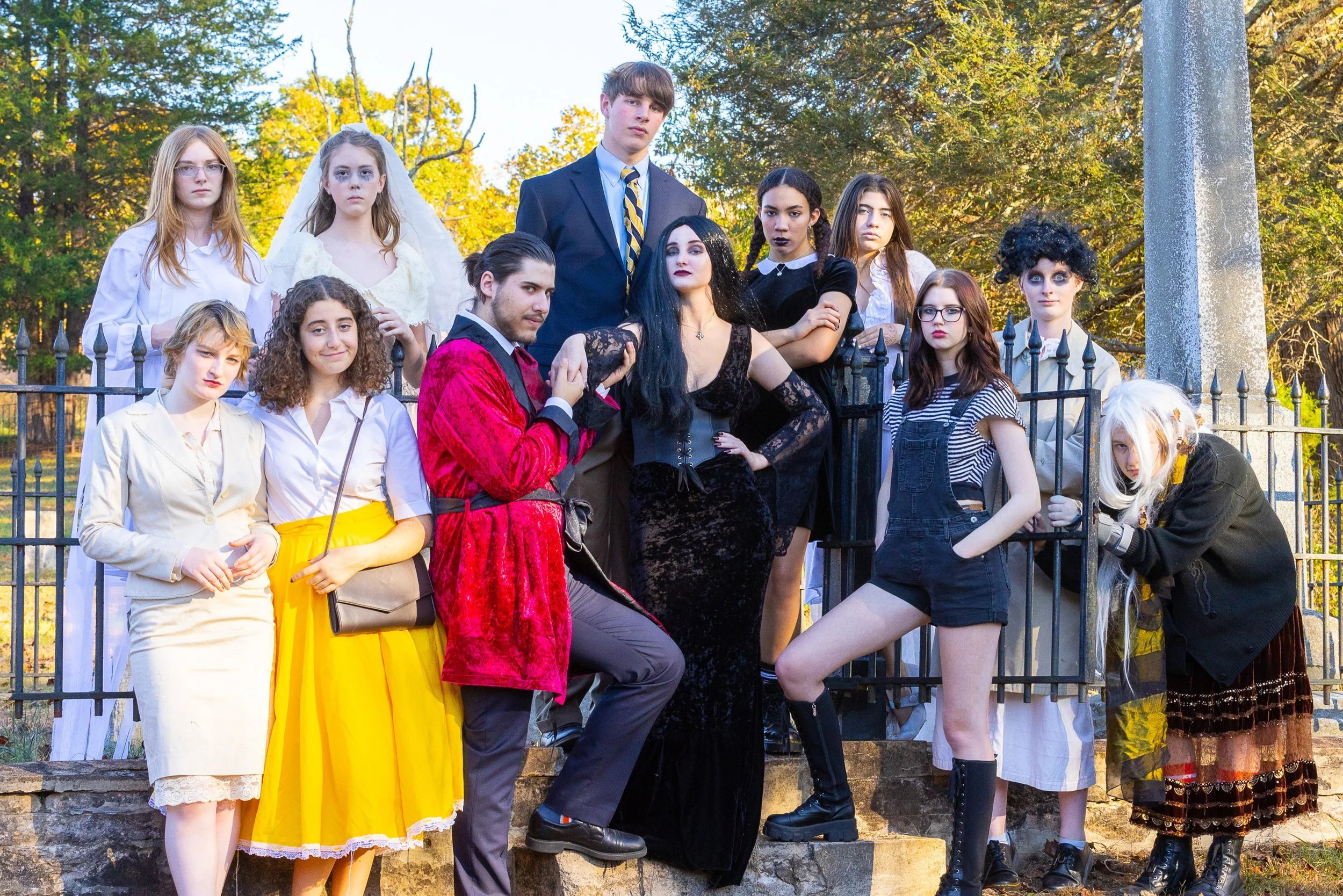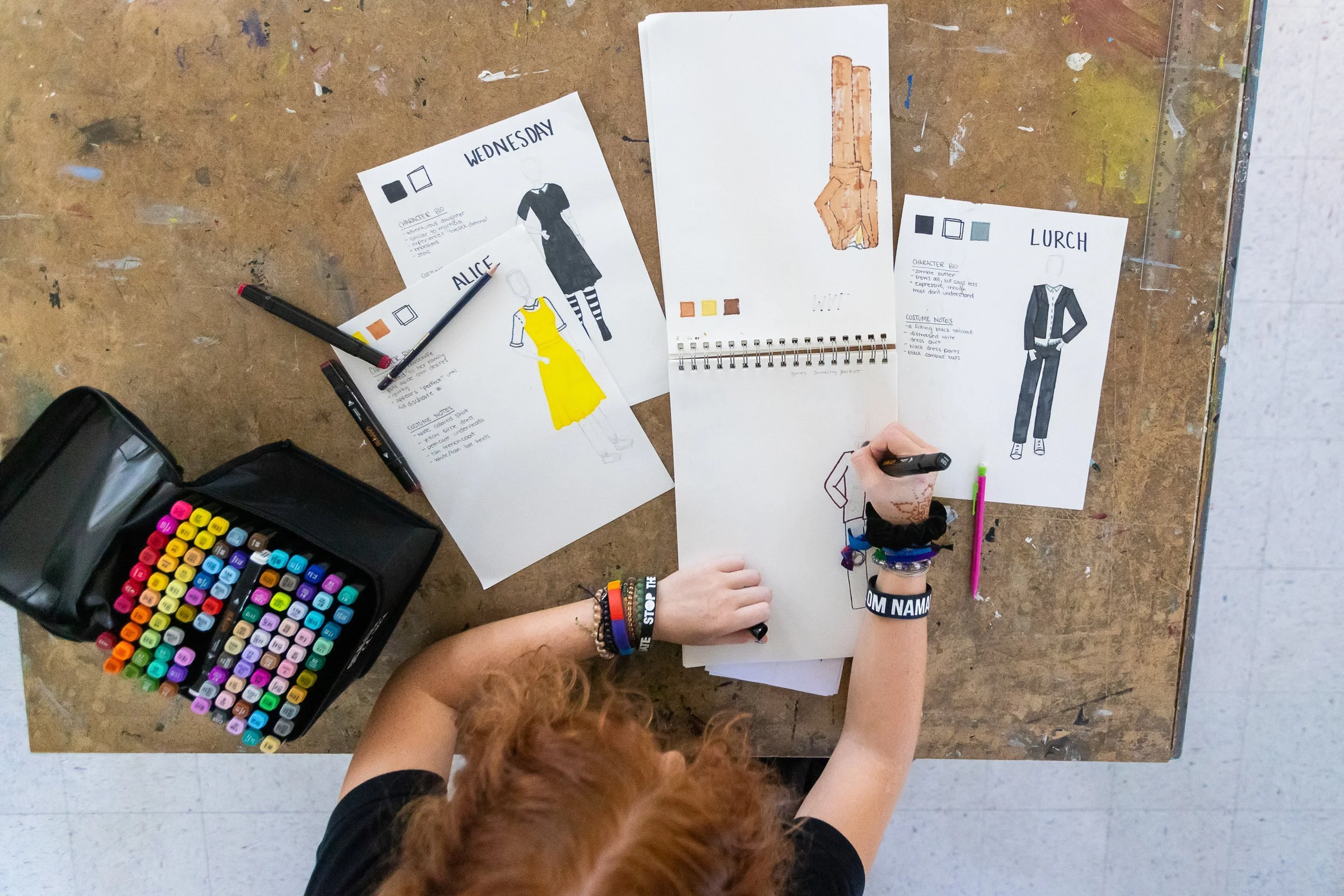 This year, Lucy wanted to further submit herself to the design process. Perusing the libretto (a musical’s text and sheet music), she noted how the outfits could parallel the story’s dynamic character arcs. She also explored the costuming in other portrayals of The Addams Family, such as the TV shows and movies, to discern how past designers have depicted the cast. After consolidating her research, Lucy began her concept sketches, aiming to preserve the famous styles while exercising her personal latitude. Lucy remarked: “In the musical, Morticia is not given the most dialogue to help the audience get a good sense of her character. To compensate, I wanted to make sure her costume accurately embodied her elegance, stoicism, and quiet allure. I tried to represent these traits by adding a corset detail and lace overlay to her iconic, slender silhouette.”