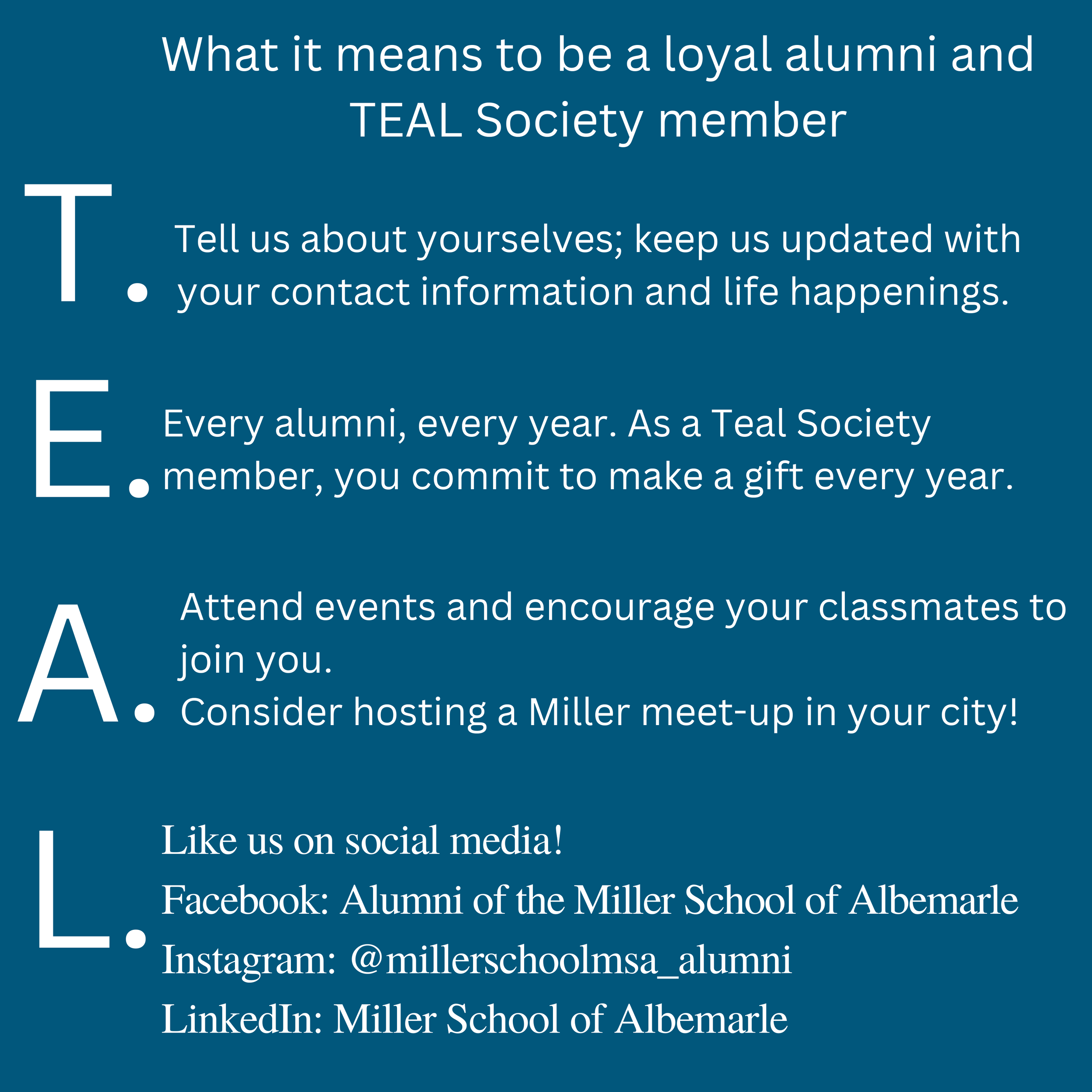 In the spirit of celebrating our past and our alumni, Miller School introduces the Teal Society, a giving society for our youngest graduates. Alumni who attended MSA in the past ten years and who make a gift to the annual fund in any amount will become a member of the Teal Society. Our goal is to recognize our recent graduates in a giving society that continues to engage them in the past, present, and future of their alma mater. Members of the Teal Society will receive a special recognition in the Bell Tower magazine published each fall and will receive some unique Miller gear.