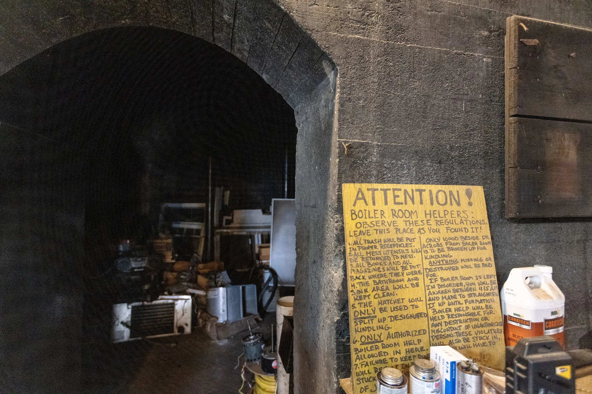 "Attention! Boiler Room Helpers: Observe these regulations." This eye-catching header is printed on a large, yellow plywood sign standing vigil near the formidable Kewanee Boiler, nestled under the Canteen. For numerous decades, this vital piece of equipment was tended to by the school's own students. These voluntary helpers kept Old Main and the other campus buildings warm during the cold winters by dutifully feeding the boiler with sawdust and kindling.